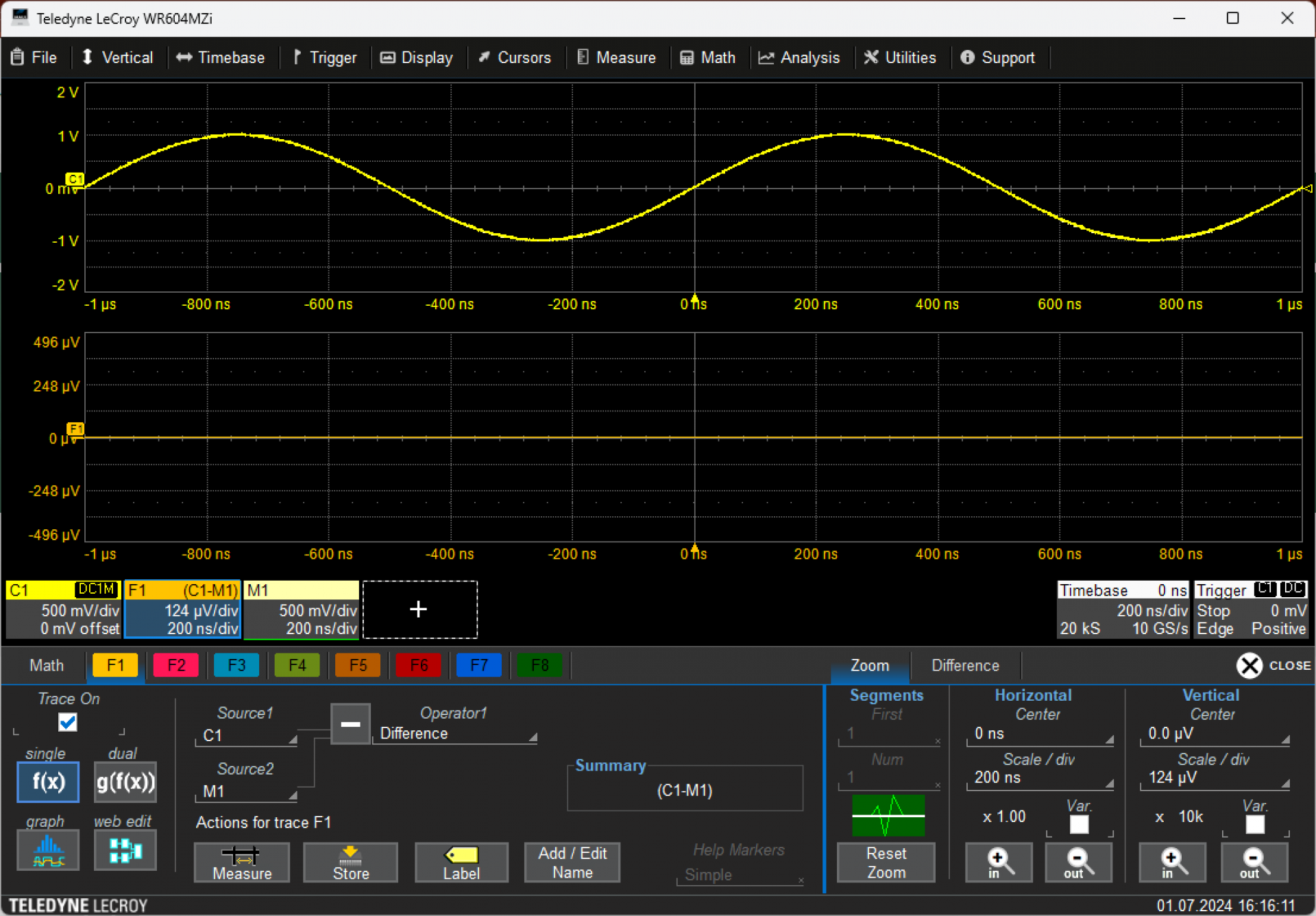 Das folgende Bild zeigt, dass die importierte LeCroy Binärkurve keine Differenz hat zum Original-Signal.