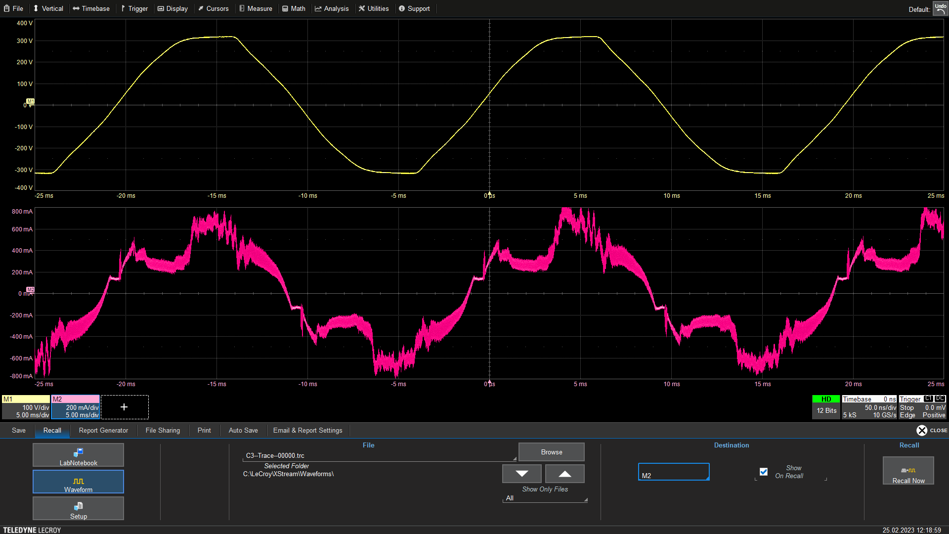 Die gespeicherten Kurven müssen nun in Memory-Kanäle geladen werden. C1-Spannung wird in M1 und C2-Strom wird in M2 geladen.